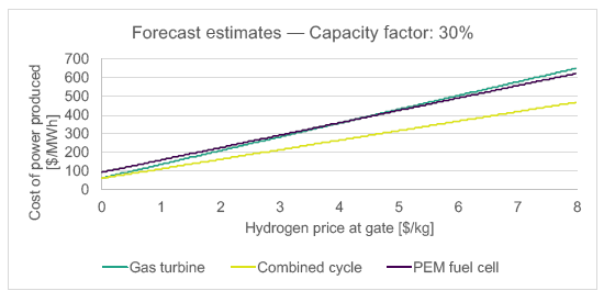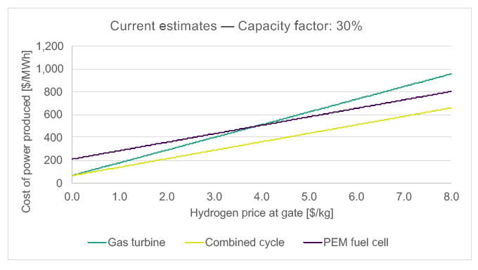 與研究團隊估算上游制氫成本的方法類似,建立了一個自下而上的模型來評估使用氫氣發(fā)電的成本。為此考慮三種發(fā)電技術:燃氣輪機、聯(lián)合循環(huán)燃氣輪機和大型固定式燃料電池。