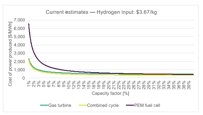 圖5.12 2020年氫燃料發(fā)電成本與容量因數(shù)的模型對比