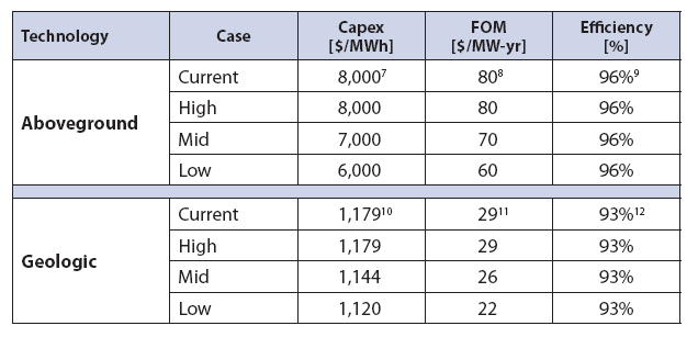 如上所述,氫氣可以作為壓縮氣體或液體儲存在地上儲罐中;或者可以作為氣體儲存在地下地質(zhì)儲存設施中。為了在建模分析中量化氫價值鏈的存儲元素,研究團隊估計了與建造氫氣存儲資產(chǎn)相關的資本成本、與運營這些資產(chǎn)相關的固定運營和維護成本以及資產(chǎn)的效率。資本成本按每單位存儲成本計量;出于建模的目的,使用美元/MWh來衡量儲存的氫氣的價值。1MWh的氫氣大約相當于30kg的氫氣。研究團隊使用能量單元進行儲氫,以便與其他儲能技術進行比較。假設年度固定運營和維護成本是資本成本的一部分。其效率以百分比形式;它說明了在儲存之前壓縮氫氣所需的能量。例如,93%的效率意味著在調(diào)節(jié)氫氣以進行儲存的過程中消耗了相當于原始氫氣量中7%的能量含量。表5.4顯示了用于估算儲氫成本的每個關鍵指標的2020年和2050年假設。