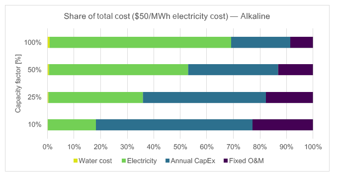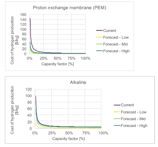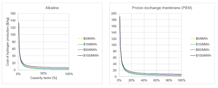 使用這些假設,該模型解決了在一系列電力成本和工廠產(chǎn)能因素(其中產(chǎn)能因素是工廠利用率的衡量標準,通常計算為實際輸出與最大輸出的比率)下生產(chǎn)氫氣的成本。結(jié)果如圖5.9所示。