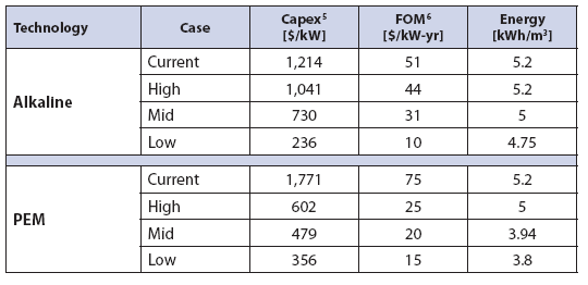 電解槽的效率以產(chǎn)生一單位氫氣所需的電能來衡量。模型假設兩種類型的系統(tǒng)具有相同的效率,并且需要 5.2 kWh的電力來生產(chǎn)一立方米的氫氣 (kWh/m3)。表 5.2 總結(jié)了研究團隊對這兩種電解槽成本和技術規(guī)格的假設。