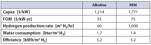 氫氣流量是指氫氣產(chǎn)生的速率。它能夠以氫氣的質(zhì)量、體積或單位時間的能量含量為單位進行描述,也可以以功率為單位進行描述。在這項研究中,假設堿性電解槽以每小時60立方米的速度生產(chǎn)氫氣,而PEM電解槽以每小時1,000立方米的速度生產(chǎn)氫氣。這一數(shù)字基于制造商康明斯公司采購的電解槽的技術規(guī)格。