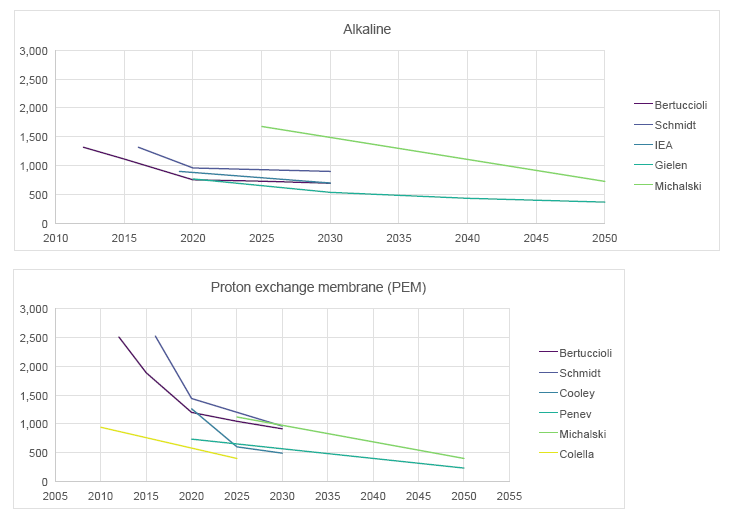 圖5.8 堿性電解槽和PEM電解槽的成本預測