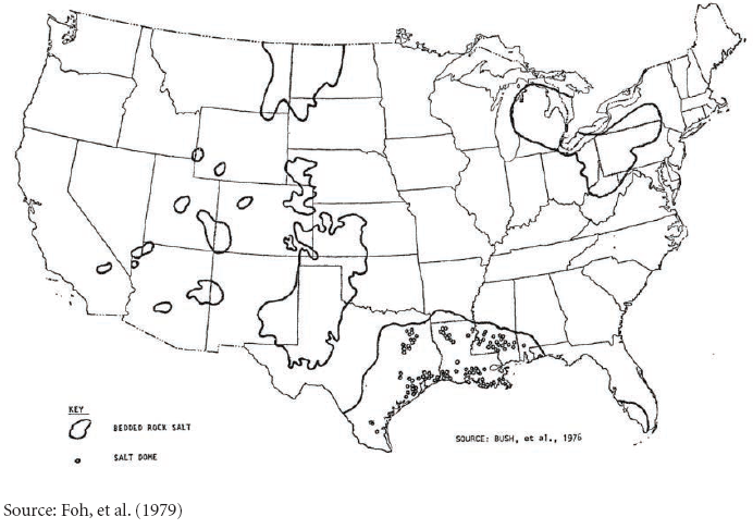 地下儲氫或地質(zhì)儲氫是一項商業(yè)上可行的技術,已經(jīng)大規(guī)模部署——事實上,氫氣目前儲存在世界各地許多地方的地下鹽洞中。地下儲存設施比地上設施大得多,并且能夠以能源為基礎儲存更多數(shù)量級的氫氣。然而,地下儲存需要合適的地質(zhì)條件,并且可以開采的鹽穴位置有限。圖5.4顯示了美國的鹽床和鹽丘。