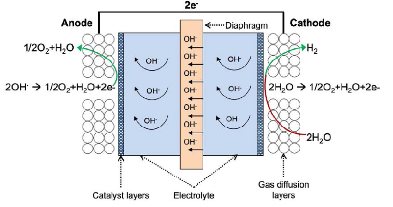 堿性電解槽是兩種主要低溫電解技術中較為成熟的一種。這些系統(tǒng)由陽極和陰極組成,根據(jù)以下反應: