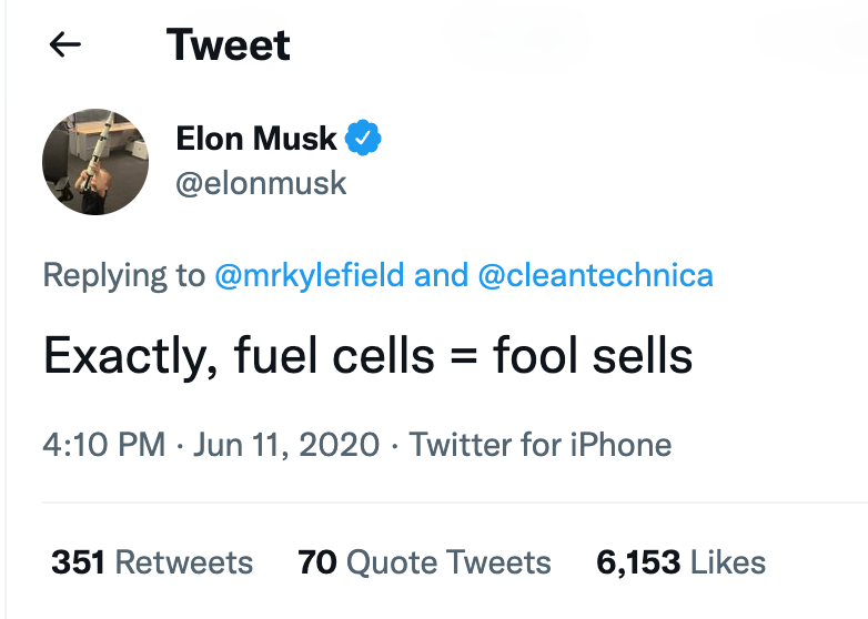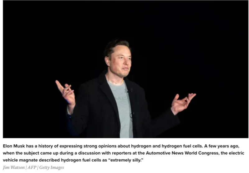 馬斯克有對氫氣和氫燃料電池發(fā)表強(qiáng)烈意見的歷史。幾年前,當(dāng)這個(gè)問題在汽車新聞世界大會上與記者討論時(shí),這位電動汽車巨頭將氫燃料電池描述為“非常愚蠢”。2020年6月,他在推特上發(fā)布了“燃料電池=傻瓜銷售”,并在當(dāng)年7月補(bǔ)充說:“氫的‘傻瓜出售’毫無意義?!?