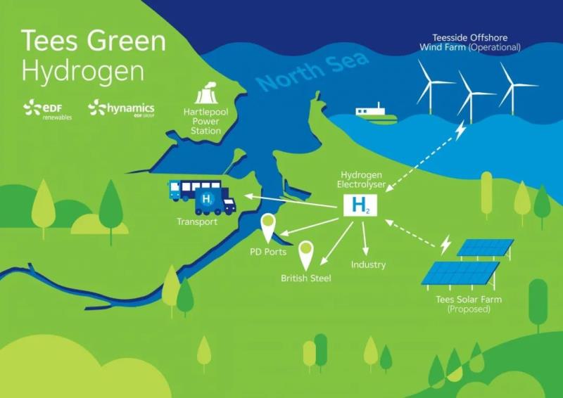 第二個(gè)是今年啟動(dòng)的英國(guó)Teesside綠氫項(xiàng)目,EDF已參與投資、建設(shè)和運(yùn)營(yíng)Teesside海上風(fēng)電場(chǎng),并計(jì)劃在Redcar附近建造的新光伏發(fā)電場(chǎng),為其氫電解槽提供動(dòng)力,進(jìn)而提供綠氫。