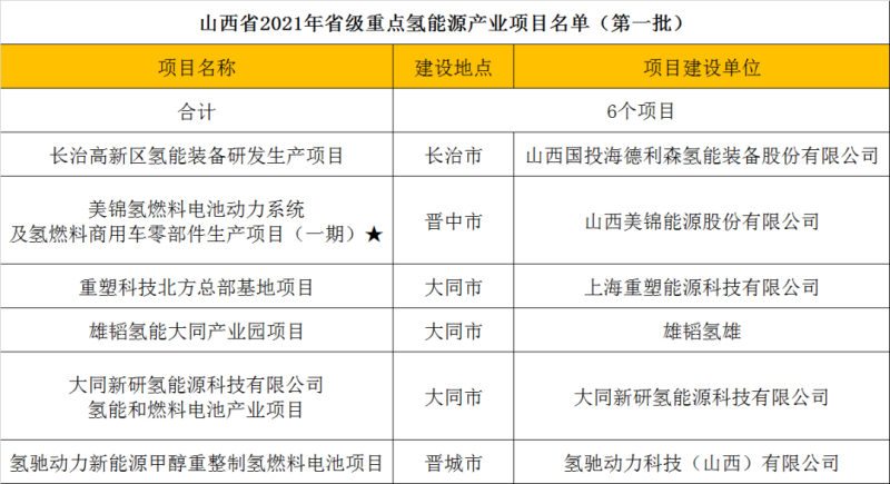 2021年5月,山西省人民政府正式發(fā)布2021年省級重點工程(第一批)項目名單,其中有6項涉及氫能,加速推進氫能裝備及燃料電池制造進程,從而“以點帶面”推動山西氫能源產(chǎn)業(yè)長足發(fā)展。