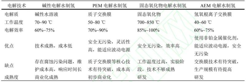 由可再生能源電解水制氫,能有效解決可再生能源消納問題,而如何提升電解水制氫的效率,降低技術(shù)成本,是突破該項技術(shù)發(fā)展的關(guān)鍵。目前電解水制氫主要分為堿性電解水制氫、質(zhì)子交換膜(PEM)電解水制氫、固態(tài)氧化物電解水制氫和陰離子交換膜(AEM)電解水制氫四種技術(shù)路線,其情況對比如表1所示。其中堿性電解水制氫技術(shù)成熟度最高,成本最低,但存在腐蝕問題,且啟停響應(yīng)時間較長,不適合波動性電源。質(zhì)子交換膜電解水制氫目前已實現(xiàn)初步商業(yè)化,其響應(yīng)速度快,能適應(yīng)波動性電源,但成本較高,且中國在質(zhì)子交換膜等核心技術(shù)上有待進一步突破。固態(tài)氧化物電解水制氫效率高,工作溫度高,目前處于小規(guī)模示范階段。陰離子交換膜電解水制氫結(jié)合了堿性電解水制氫和質(zhì)子交換膜電解水制氫的優(yōu)點,成本較低,且能很好地適應(yīng)波動性電源。該技術(shù)目前尚處于研發(fā)階段,生產(chǎn)規(guī)模受到限制。