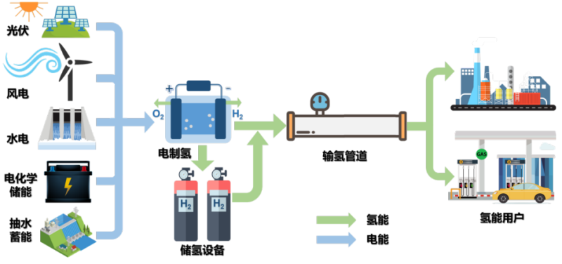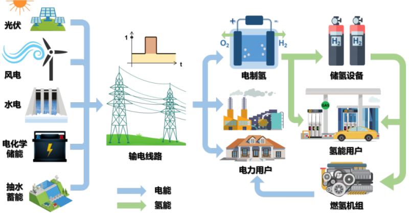 氫能為大范圍、長(zhǎng)周期的電力電量平衡問(wèn)題提供了新的解決方案。氫能可作為電力系統(tǒng)的靈活性資源、長(zhǎng)周期儲(chǔ)能和外送新載體,為新型電力系統(tǒng)緩解高效消納與穩(wěn)定外送的壓力。電氫耦合有望破解新能源大規(guī)模發(fā)展后電力系統(tǒng)的靈活調(diào)節(jié)問(wèn)題,成為新型電力系統(tǒng)的重要組成部分。