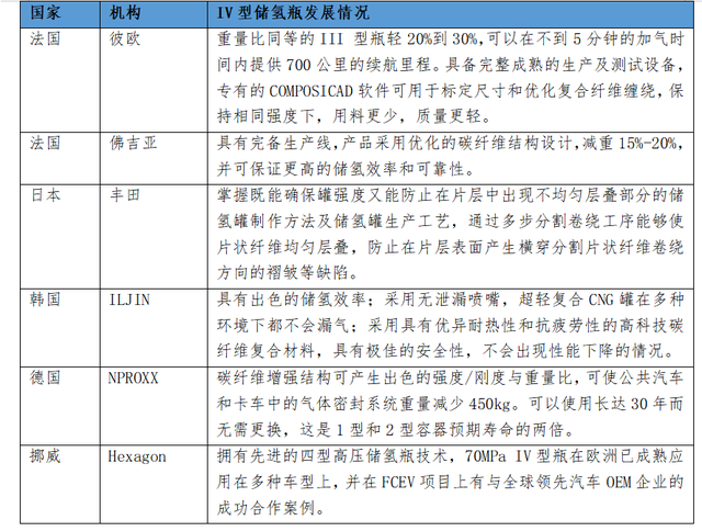 Ⅳ型儲(chǔ)氫瓶優(yōu)勢(shì)明顯,符合未來氫能產(chǎn)業(yè)發(fā)展要求。目前,在國內(nèi)應(yīng)用較多的是III型儲(chǔ)氫瓶(鋁內(nèi)膽纖維纏繞瓶),在國外應(yīng)用較多的是Ⅳ型儲(chǔ)氫瓶。Ⅳ型瓶優(yōu)勢(shì)更明顯:一是從技術(shù)上來講,其采用非金屬內(nèi)膽,具有優(yōu)異的抗氫脆腐蝕能力,相對(duì)金屬內(nèi)膽的III型瓶更具安全優(yōu)勢(shì);在通過相同外徑、容積和壓力(70MPa)條件下,Ⅳ型儲(chǔ)氫瓶儲(chǔ)氫密度可以達(dá)到5.5%,高于III型瓶的3.9%;成品重量為48KG,比III型瓶輕22.5%;二是從經(jīng)濟(jì)性上來講,Ⅳ型儲(chǔ)氫瓶制造成本只有III型瓶的63.5%,而且其由于內(nèi)膽為塑料,不易疲勞失效,使用壽命較長,進(jìn)一步降低了消費(fèi)成本。車載儲(chǔ)氫系統(tǒng)的發(fā)展趨勢(shì)為安全、高儲(chǔ)氫密度、輕量化、低成本、成壽命,因此III型瓶向Ⅳ型瓶轉(zhuǎn)變是符合未來氫能產(chǎn)業(yè)發(fā)展要求的,Ⅳ型瓶也將會(huì)成為氫燃料電池乘用車的首選儲(chǔ)能裝備。