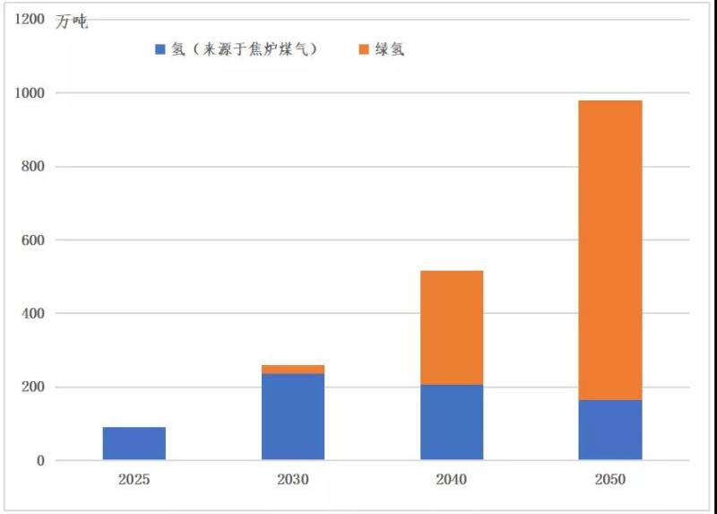 氫氣作為氫冶金的基本原料,其供求關(guān)系直接影響氫冶金推進(jìn)的程度。綜合我國鋼鐵行業(yè)政策規(guī)劃、專家訪談及數(shù)據(jù)分析,預(yù)計(jì)到2030年氫冶金產(chǎn)量為0.21-0.29億噸,約占全國鋼鐵總產(chǎn)量的2.3%-3.1%。基于氫冶金的氫氣需求約為191-259萬噸。氫冶金用氫需求中約92%來自焦?fàn)t煤氣,剩余約8%來自電解水制氫。到2050年,氫冶金鋼產(chǎn)量為0.96-1.12億噸,基于氫冶金的氫氣需求約為852-980萬噸。其中焦?fàn)t煤氣提供166萬噸氫,剩余814萬噸來自于綠氫。