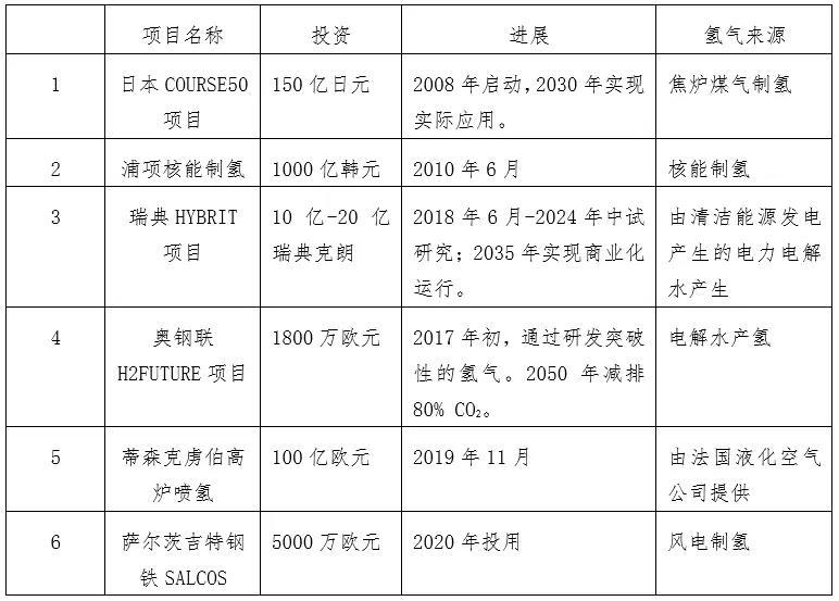 國內(nèi)方面,20世紀(jì)60年代,本鋼高爐、鞍鋼9號(hào)高爐分別進(jìn)行了高爐焦?fàn)t煤氣噴吹試驗(yàn)。多年來氫冶金進(jìn)展緩慢。近年,各大鋼鐵企業(yè)提出氫冶金規(guī)劃并積極籌建氫冶金氣基豎爐生產(chǎn)線或示范工程。2021年5月,河鋼集團(tuán)在河北張家口啟動(dòng)建設(shè)“全球首例富氫氣體直接還原示范工程”,從改變能源結(jié)構(gòu)入手,推動(dòng)鋼鐵冶金工藝變革。2021年第三季度,中國寶武將在湛江鋼鐵開工建設(shè)(一期)1座百萬噸級(jí)、具備全氫工藝試驗(yàn)條件的氫基豎爐直接還原示范工程及配套設(shè)施,可按不同比例靈活使用焦?fàn)t煤氣、天然氣和氫氣。不僅龍頭企業(yè)積極發(fā)揮帶頭作用,首鋼、建龍、酒鋼、日照鋼鐵等一批鋼鐵企業(yè)也建立了低碳冶金示范項(xiàng)目。一大批低碳鋼鐵科研機(jī)構(gòu)也紛紛成立,如東北大學(xué)組建低碳鋼鐵前沿技術(shù)研究院,河鋼集團(tuán)與北京科技大學(xué)共同發(fā)起世界鋼鐵發(fā)展研究院,通過產(chǎn)學(xué)研的力量推動(dòng)中國氫冶金的發(fā)展。