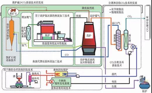 以焦炭為還原劑的高爐煉鐵是煉鋼中主要的碳排放過程。根據(jù)2020年中國鋼鐵工業(yè)協(xié)會(huì)統(tǒng)計(jì)的數(shù)據(jù)顯示,其會(huì)員單位的高爐煉鐵入爐焦比為355.19kg/t,煉鐵過程產(chǎn)生的碳排放量為每噸生鐵1.3噸CO2。在高爐煉鐵中,采用技術(shù)工藝優(yōu)化、焦?fàn)t煤氣噴吹等方式可降低焦炭的使用量,從而達(dá)到減排的作用。例如用噴吹氫代替10%的焦炭,可減少約5%-10%的碳排放量。