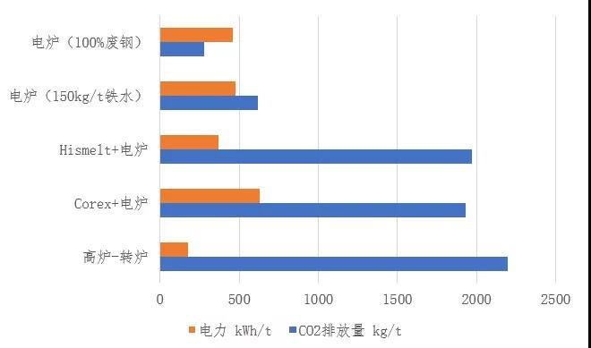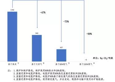 我國現(xiàn)有高爐和轉(zhuǎn)爐路線碳排放量為1.765噸CO2/噸鐵。對(duì)于高品位的鐵礦石,可采用直接還原和電弧爐路線。采用以80%的天然氣直接還原鐵和20%的廢鋼生產(chǎn)工藝,天然氣先經(jīng)過裂解或重整,產(chǎn)生C、CO、H2。由于天然氣本身含氫元素,參與還原反應(yīng)的碳比高爐少,碳排放量明顯降低。據(jù)測算,比現(xiàn)有的高爐轉(zhuǎn)爐路線,可降低碳排放量47%。采用以80%的綠色氫氣直接還原鐵和20%的廢鋼生產(chǎn)工藝,可降低75%碳排放。當(dāng)全部采用100%綠色氫氣直接還原鐵和電弧爐路線時(shí),幾乎沒有碳排放。