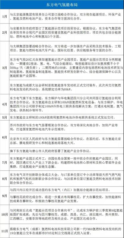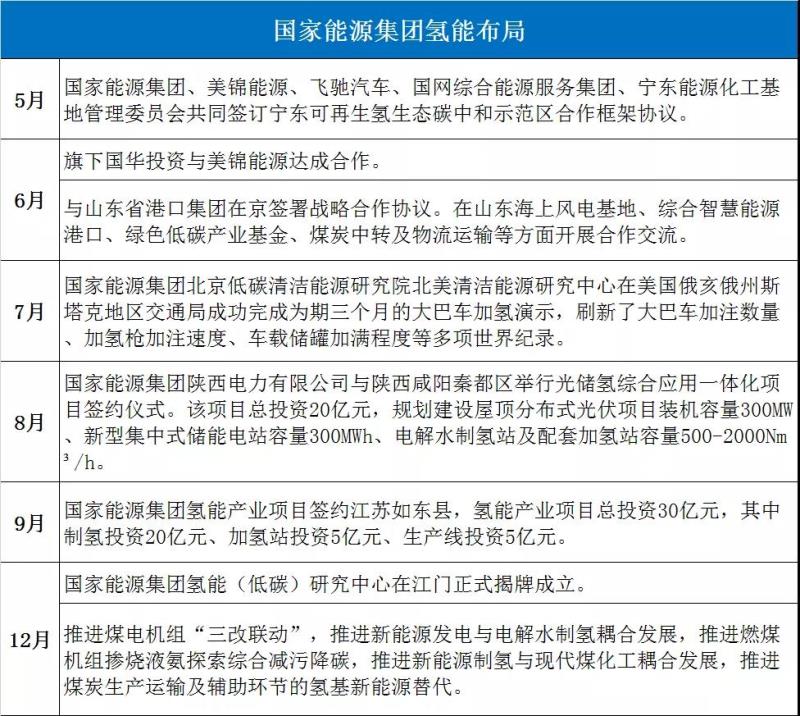 今年以來,以中國(guó)石化、中國(guó)石油、國(guó)家電投、國(guó)家能源集團(tuán)、東方電氣、中國(guó)能建、中國(guó)船舶、華能集團(tuán)、華電集團(tuán)、東風(fēng)汽車、中車集團(tuán)、一汽集團(tuán)為代表的央企氫能布局表現(xiàn)突出,典型事件如下:
