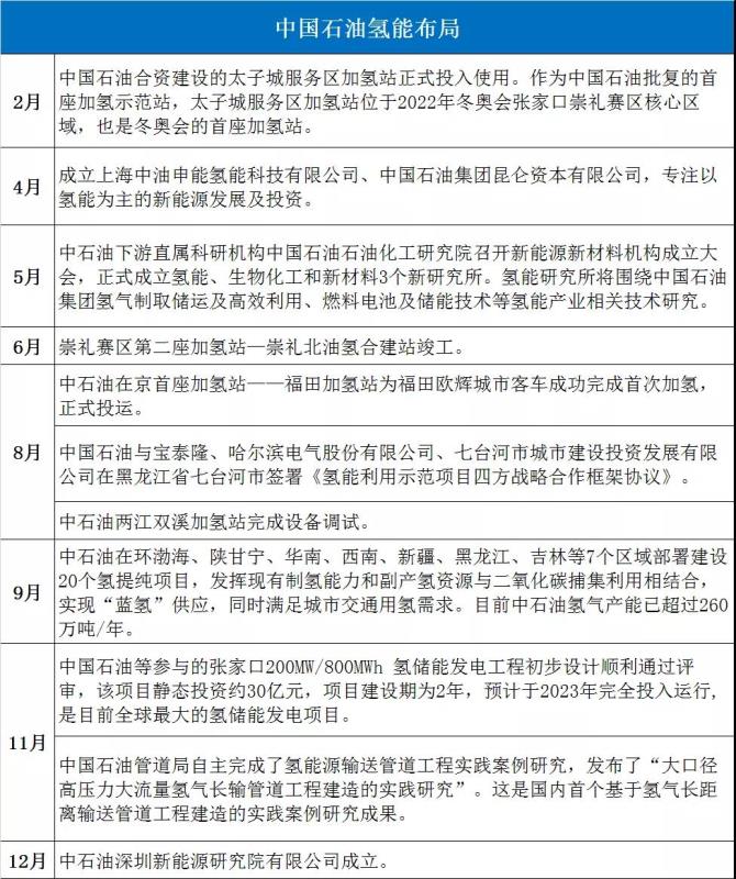 相比于中國(guó)石化,中國(guó)石油在氫能方面布局的動(dòng)作相對(duì)小些,但相比于去年同期,今年中國(guó)石油涉足的深度和廣度都有所增加(如下圖)。未來,中國(guó)石油還將在全國(guó)范圍投運(yùn)50座加氫站。