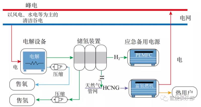 氫儲能是支撐高比例可再生能源發(fā)展有效方式之一。傳統(tǒng)電 -氫 -電的儲能方式綜合效率低、造價高,現(xiàn)階段不具備經(jīng)濟(jì)適用性。借助我國跨區(qū)域特高壓輸電通道優(yōu)勢,將可再生資源豐富地區(qū)的電能輸送到高純氫負(fù)荷中心,建設(shè)氫儲能調(diào)峰站,谷電時段制氫儲能(P2H),峰電時段天然氣摻氫富氫燃機(jī)發(fā)電回饋電網(wǎng),可以實(shí)現(xiàn)可再生能源消納,提高輸電通道利用率,緩解東部城市峰谷電差大的問題,解決氫氣遠(yuǎn)距離運(yùn)輸成本、安全等難題。
