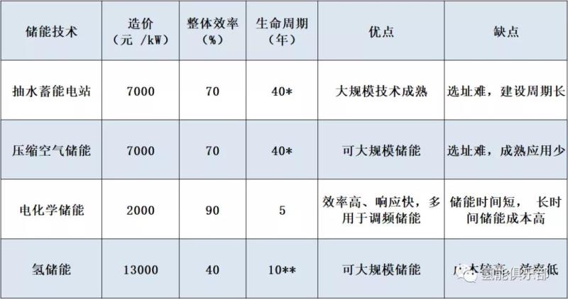 氫儲能目前存在的問題是效率較低、造價高。電解水制氫效率達(dá) 65%~75%,燃料電池發(fā)電效率為 50%~60%,單過程轉(zhuǎn)換效率相對較高,但電 - 氫 -電過程存在兩次能量轉(zhuǎn)換,整體效率較低。制氫設(shè)備的單位造價約 2000 元 /kW,儲氫和輔助系統(tǒng)造價為 2000 元 /kW,燃料電池發(fā)電系統(tǒng)造價約9000 元 /kW,燃料電池的投資占到氫儲能系統(tǒng)總投資的接近 70%;且現(xiàn)階段規(guī)?;剂想姵匕l(fā)電系統(tǒng)應(yīng)用較少,技術(shù)成熟度、系統(tǒng)壽命有待驗(yàn)證。