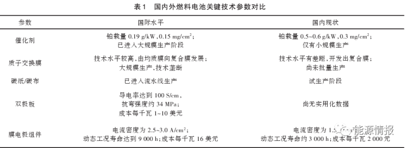 總體來說,制約我國氫能源發(fā)展的還是燃料電池電堆和關(guān)鍵材料。國產(chǎn)電堆在功率密度、系統(tǒng)功率、壽命等方面與先進(jìn)水平相比還有差距;質(zhì)子交換膜、催化劑、膜電極等關(guān)鍵材料和高壓比空壓機、氫氣循環(huán)泵等關(guān)鍵設(shè)備依賴進(jìn)口,產(chǎn)品價格較高,國內(nèi)外燃料電池關(guān)鍵技術(shù)參數(shù)對比如表1所示。因此,我國需注重核心材料和關(guān)鍵技術(shù)的突破,補足短板。