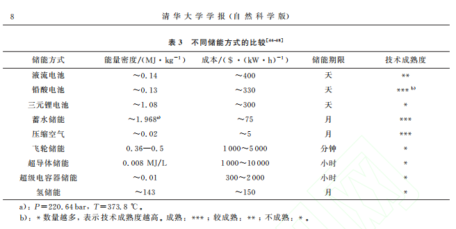 3)電磁儲能,包括超導體儲能和超級電容 器儲能.氫儲能的基本原理是電解水產(chǎn)生氫氣和氧氣,可以將其看作是化學儲能的延伸。表3歸納了不同儲能方式的能量密度、成 本、儲能期限和技術成熟度。對比可知,氫儲能相比于其他儲能方式有諸多優(yōu)點.氫儲能的能量 密度顯著高于其他儲能方式,儲能期限較長,滿 足長時間儲能的需求,可實現(xiàn)可再生能源的跨季 儲能和跨區(qū)域能量傳遞.此外,電解水制氫可以提高可再生能源利用率,減少化石燃料的使用, 提高能源體系清潔化。氫儲能成本低于電化學儲能、電磁儲能和飛輪儲能,盡管略高于發(fā)展時間較久的壓縮空氣儲能和蓄水儲能,但隨著氫氣制備和儲運技術的進一步發(fā)展,市場規(guī)模的進一步擴大,成本將會進一步降低.氫儲能是前景廣闊的可再生能源儲能方式,可在能源互聯(lián)網(wǎng)的構建方面發(fā)揮重要作用。