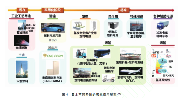 如圖4所示,日本對不同階段氫能在不同領 域的應用進行了分析,顯示了氫能在當下能源系 統(tǒng)中的重要位置以及未來能源互聯(lián)網(wǎng)系統(tǒng)中的具體應用前景.目前,日本比較成熟的氫能應用包括石油精煉、光纖制造等工業(yè)制造領域和被當作高能燃料使用的航空航天領域;目前處于實用化階段的應用主要包括燃料電池汽車和家用燃料電池電站;隨著氫能相關技術的不斷進步, 未來還會進一步被用于業(yè)務產(chǎn)業(yè)用燃料電池發(fā)電、家用或特殊用途的燃料電池、不同類型的燃料電池交通工具(包括業(yè)務用車、公共汽車、列車、船、飛機)等 各種備用電源,以及更多的工業(yè)應用等。