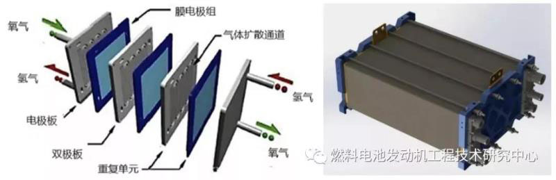 電堆是發(fā)生電化學(xué)反應(yīng)的場所,也是燃料電池動力系統(tǒng)核心部分,由多個單體電池以串聯(lián)方式層疊組合構(gòu)成。將雙極板與膜電極交替疊合,各單體之間嵌入密封件,經(jīng)前、后端板壓緊后用螺桿緊固拴牢,即構(gòu)成燃料電池電堆。
