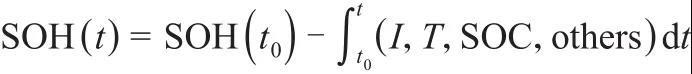 式中,SOH(t0)為電池初始的健康狀態(tài);δfunc為電池老化率函數(shù)(取決于電流、溫度、SOC等因素);others為其他因素如機(jī)械振動(dòng)和過電勢(shì)等。目前,對(duì)鋰電池SOH的評(píng)判指標(biāo)主要有最大可用容量及電池內(nèi)阻,估計(jì)方法主要有實(shí)驗(yàn)法、模型法、數(shù)據(jù)驅(qū)動(dòng)法及融合法。