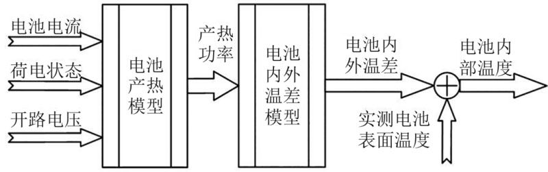 Kim等基于降階的分布參數(shù)模型,使用卡爾曼濾波器與擴(kuò)展卡爾曼濾波器相結(jié)合的方法對(duì)電池系統(tǒng)對(duì)流系數(shù)進(jìn)行辨識(shí)和內(nèi)部溫度估計(jì)。Lin等針對(duì)22650型鋰電池,設(shè)計(jì)了一種基于在線參數(shù)化方法和表面溫度測(cè)量的在線參數(shù)辨識(shí)方案對(duì)電池內(nèi)部溫度進(jìn)行估計(jì)。劉光明等用Fluent軟件建立了三維熱模型后得到了一個(gè)電池產(chǎn)熱功率關(guān)于電池內(nèi)外溫差的函數(shù),通過產(chǎn)熱功率和電池表面溫度估計(jì)其內(nèi)部的溫度,表明了具有在BMS中應(yīng)用的潛力。圖4為電池內(nèi)部溫度的估計(jì)流程。