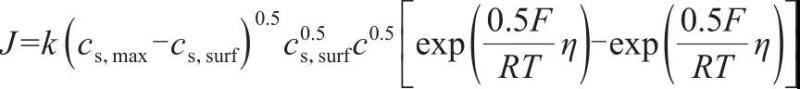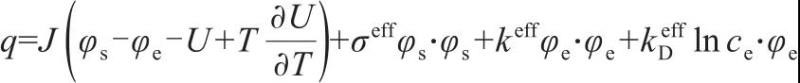 式中,φs、φe分別為固相以及液相中的電勢(shì);σeff為固相顆粒的電導(dǎo)率;keff為電化學(xué)反應(yīng)速率常數(shù);kDeff為液相離子電導(dǎo)率;ce為電解質(zhì)濃度;cs,max為固相中插入的鋰離子最大濃度;cs,surf為固相表面的鋰離子濃度;F為法拉第常數(shù);R為氣體常數(shù);η為電化學(xué)反應(yīng)超電勢(shì)。