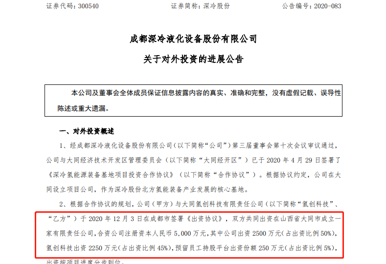根據(jù)合作協(xié)議的規(guī)劃,公司(甲方)與大同氫創(chuàng)科技有限責(zé)任公司(“氫創(chuàng)科技”、“乙方”)于2020年12月3日在成都市簽署《出資協(xié)議》,雙方共同出資在山西省大同市成立一家有限責(zé)任公司,公司名稱:山西深冷氫能科技發(fā)展有限公司(暫定名),合資公司注冊資本人民幣5000萬元,其中公司出資2500萬元(占出資比例50%),氫創(chuàng)科技出資2250萬元(占出資比例45%),預(yù)留員工持股平臺出資份額250萬元(占出資比例5%),出資按項(xiàng)目進(jìn)度分步到位。