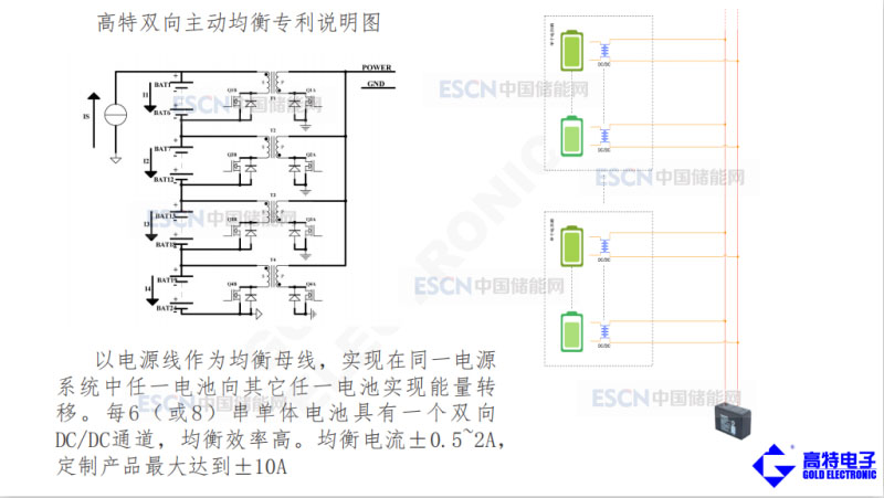 這是高特主動均衡的方案,在一簇電池當(dāng)中比如說200節(jié)電池,挑出最高10個,最低10個,最高的10個放電,最低10充電,實現(xiàn)任何電池之間的能量轉(zhuǎn)移。這是原理圖,高的電池放到電源端,如果有低的電池就給低的電池充,兩個電路一合并,就看到完成了從高電池到低電池的能量轉(zhuǎn)移。