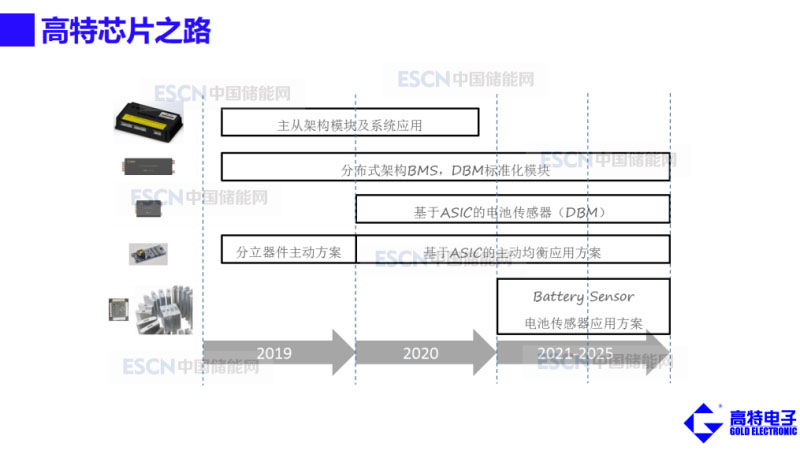 這是高特的芯片之路,現(xiàn)在完成的是采集和主動均衡的芯片,在2020到2025年已經(jīng)規(guī)劃了兩代芯片,下一步是SOC的ASIC應(yīng)用方案,最后要把芯片放到電芯內(nèi),這時候BMS將不復(fù)存在,我們都已經(jīng)內(nèi)置了,這是高特的終極目標(biāo),目前在做的分為兩步走,到2025年達成這個目標(biāo)。
