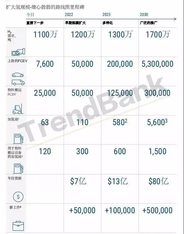 到2030年,氫需求量將突破1700萬噸,在美國(guó)道路上有530萬輛FCEV,在物料搬運(yùn)中有300000輛FCEV搬運(yùn)工具,在全美范圍內(nèi)有5600個(gè)加氫站。