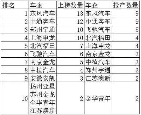 有意思的是,對比13批共91款《推薦目錄》的上榜車型及企業(yè),投產(chǎn)車型的排名出現(xiàn)了一定的變化。東風(fēng)與宇通在兩份榜單上均名列前2,但在之后則出現(xiàn)了較大的差異,如有10款上榜推薦目錄的宇通與申龍,分別只投產(chǎn)了3款與4款汽車,而只有2款車型上榜目錄的金華青年與江蘇澳新全部投產(chǎn)。