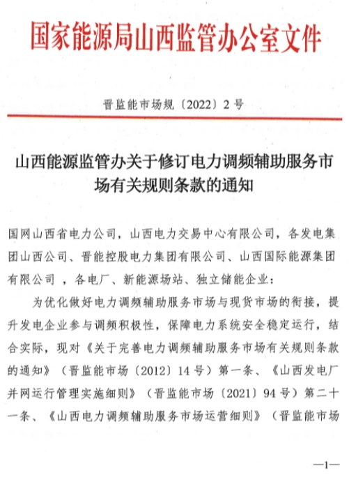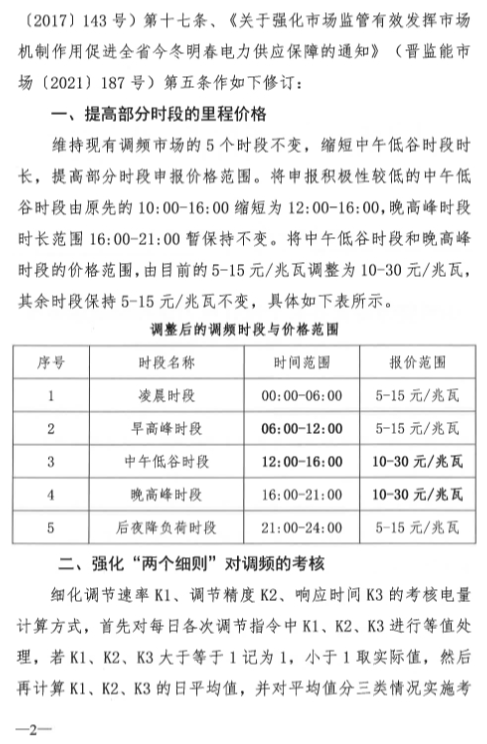 中國儲能網(wǎng)訊:近日,山西能源監(jiān)管辦發(fā)布關(guān)于修訂電力調(diào)頻輔助服務(wù)市場有關(guān)規(guī)定條款的通知,提高部分時段里程價格,強(qiáng)化“兩個細(xì)則”對調(diào)頻的考核。