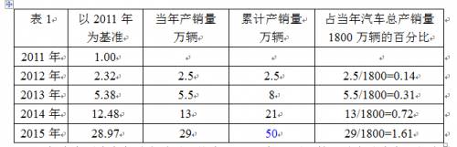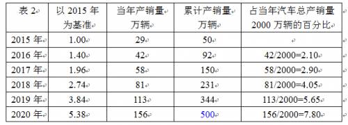 假設(shè)這5年內(nèi)全國汽車年總產(chǎn)銷量平均為2000萬輛,則可算出純電動(dòng)汽車和插電式混合動(dòng)力汽車在汽車總產(chǎn)銷量中的百分比(見表2最后一列)。