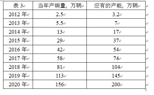 到2020年純電動(dòng)汽車和插電式混合動(dòng)力汽車生產(chǎn)能力要求達(dá)200萬輛。由于當(dāng)年新增的電動(dòng)汽車和插電式混合動(dòng)力汽車生產(chǎn)能力在當(dāng)年內(nèi)難以充分發(fā)揮作用,當(dāng)年產(chǎn)銷量要低于可達(dá)的年生產(chǎn)能力。以2020年為例,這兩個(gè)數(shù)分別為156萬和200萬,即當(dāng)年產(chǎn)銷量約為可達(dá)年生產(chǎn)能力的78%。