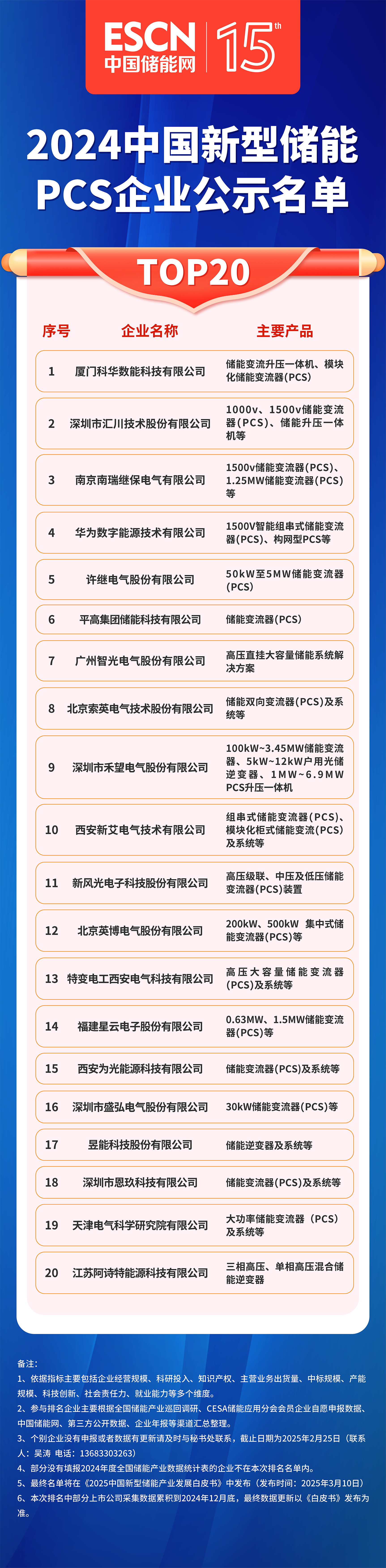 評(píng)選指標(biāo)主要包括企業(yè)經(jīng)營規(guī)模、科研投入、知識(shí)產(chǎn)權(quán)、主營業(yè)務(wù)出貨量、中標(biāo)規(guī)模、產(chǎn)能規(guī)模、科技創(chuàng)新、社會(huì)責(zé)任力、就業(yè)能力等多個(gè)維度。以下為2024中國新型儲(chǔ)能PCS企業(yè)TOP20名單。