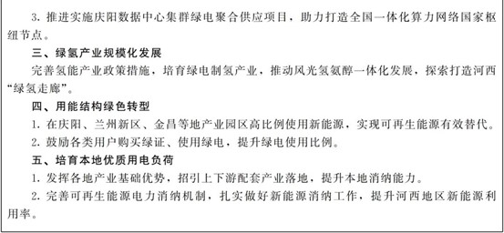 (九)促進用能結(jié)構(gòu)綠色轉(zhuǎn)型。大力實施可再生能源替代行動,構(gòu)建以電能消費為主導(dǎo)的清潔能源消費體系。穩(wěn)步有序推進工業(yè)、交通運輸、建筑、農(nóng)業(yè)農(nóng)村、新基建等領(lǐng)域用能綠電替代。倡導(dǎo)企事業(yè)單位辦公綠色用能,提高城鄉(xiāng)居民終端用能電氣化水平,持續(xù)提升電能占終端能源消費比重。(責(zé)任單位:省能源局、省發(fā)展改革委、省工信廳、省交通運輸廳、省住建廳、省農(nóng)業(yè)農(nóng)村廳、省機關(guān)事務(wù)局、國網(wǎng)甘肅省電力公司)