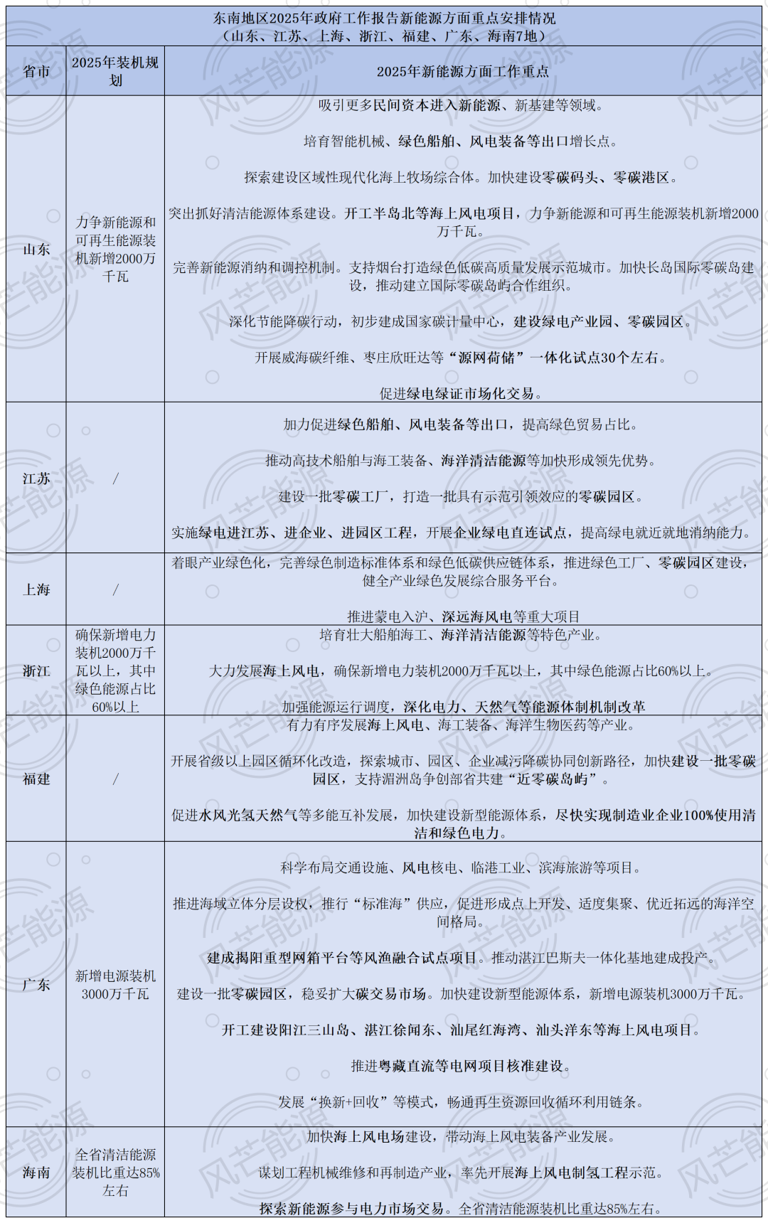東南地區(qū)統(tǒng)計(jì)為山東、江蘇、上海、浙江、福建、廣東、海南7地。東南地區(qū)臨海,7個地區(qū)均在政府工作報(bào)告中強(qiáng)調(diào),發(fā)展建設(shè)海上風(fēng)電項(xiàng)目。