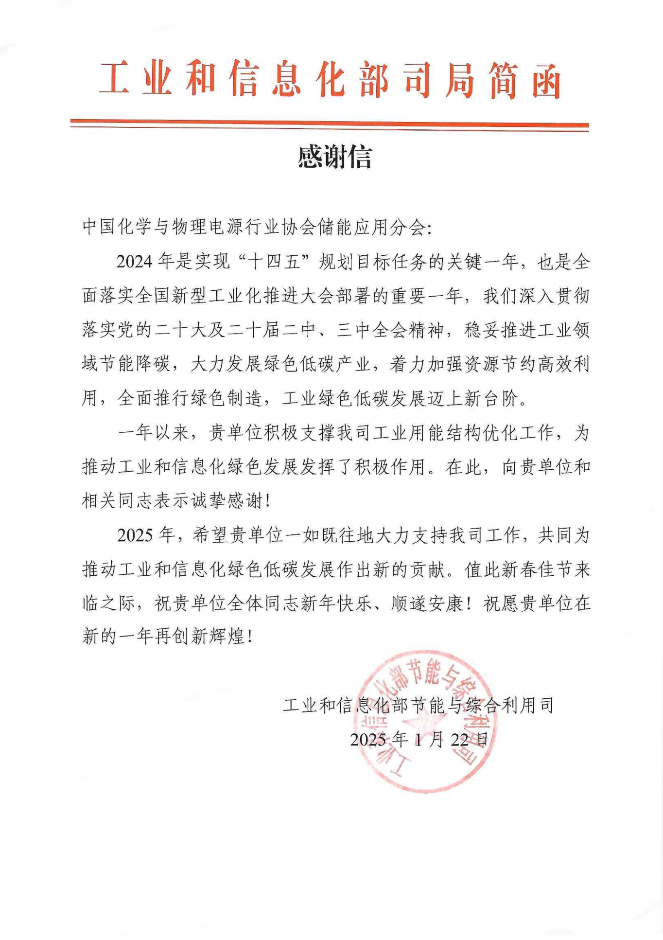 中國儲能網(wǎng)訊:近日,工業(yè)和信息化部節(jié)能與綜合利用司向中國化學(xué)與物理電源行業(yè)協(xié)會儲能應(yīng)用分會致感謝信。