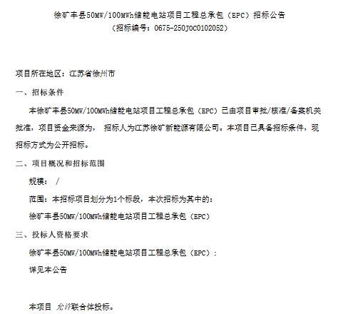 中國儲能網(wǎng)訊:2月18日,江蘇徐礦新能源有限公司發(fā)布了徐礦豐縣50MW/100MWh儲能電站項目工程總承包(EPC)招標公告,項目位于江蘇省徐州市豐縣經(jīng)濟開發(fā)區(qū),本期項目建設50MW/100MWh磷酸鐵鋰儲能,擬新建儲能電站單回110kV線路T接110kv常史966線,新建110kv桿塔1基、電纜通道長約0.067km,電纜采用400m㎡截面單芯電纜。