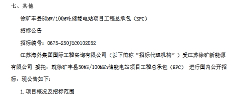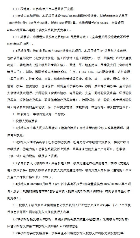 要求投標人自2022年01月01日(含)以來具有不少于1份容量規(guī)模為50MW/100MWh(單個項目)及以上規(guī)模的儲能電站EPC總承包業(yè)績。