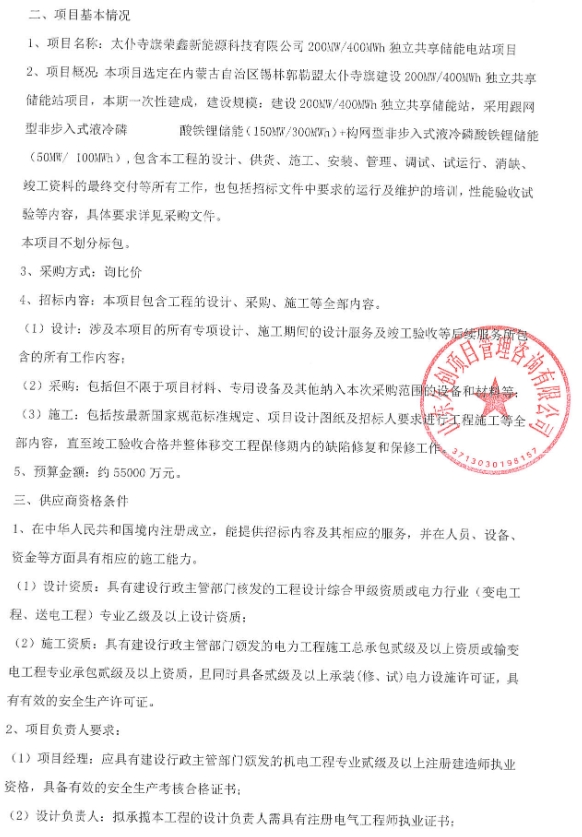 中國(guó)儲(chǔ)能網(wǎng)訊:2月19日,太仆寺旗榮鑫新能源科技有限公司200MW/400MWh獨(dú)立共享儲(chǔ)能電站項(xiàng)目EPC總承包詢比采購(gòu)公告發(fā)布,本項(xiàng)目選定在內(nèi)蒙古自治區(qū)錫林郭勒盟太仆寺旗建設(shè),本期一次性建成,建設(shè)200MW/400MWh獨(dú)立共享儲(chǔ)能站,采用跟網(wǎng)型非步入式液冷磷酸鐵鋰儲(chǔ)能(150MW/300MWh)+構(gòu)網(wǎng)型非步入式液冷磷酸鐵鋰儲(chǔ)能(50MW/ 100MWh),包含本工程的設(shè)計(jì)、供貨、施工、安裝、管理、調(diào)試、試運(yùn)行、消缺、竣工資料的最終交付等所有工作,也包括招標(biāo)文件中要求的運(yùn)行及維護(hù)的培訓(xùn),性能驗(yàn)收試驗(yàn)等內(nèi)容。