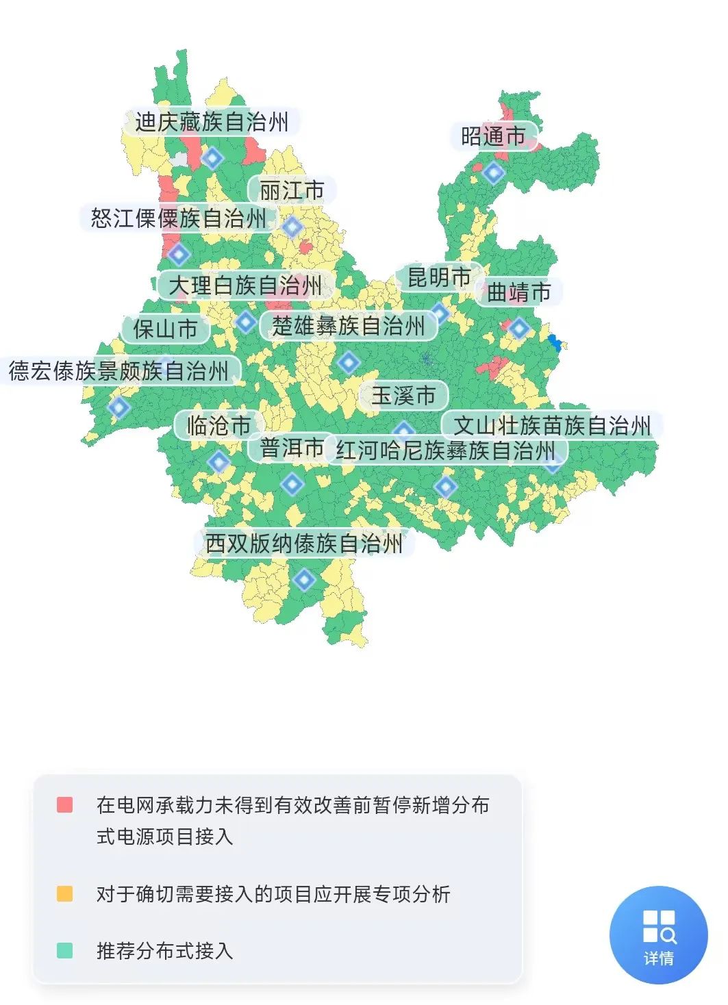 目前,全省129個(gè)縣(市、區(qū))中,官渡區(qū)、呈貢區(qū)等97個(gè)區(qū)域?yàn)榫G色,代表當(dāng)?shù)胤植际焦夥娋W(wǎng)接入條件良好,可即裝即并、就地消納;麒麟?yún)^(qū)、勐??h等30個(gè)區(qū)域?yàn)辄S色,代表當(dāng)?shù)匾褵o(wú)消納能力,電網(wǎng)接入困難,分布式光伏建設(shè)前需開(kāi)展接入電網(wǎng)分析;賓川縣、福貢縣等2個(gè)區(qū)域?yàn)榧t色,意味著在電網(wǎng)承載力有效改善前,暫停新增分布式光伏接入。