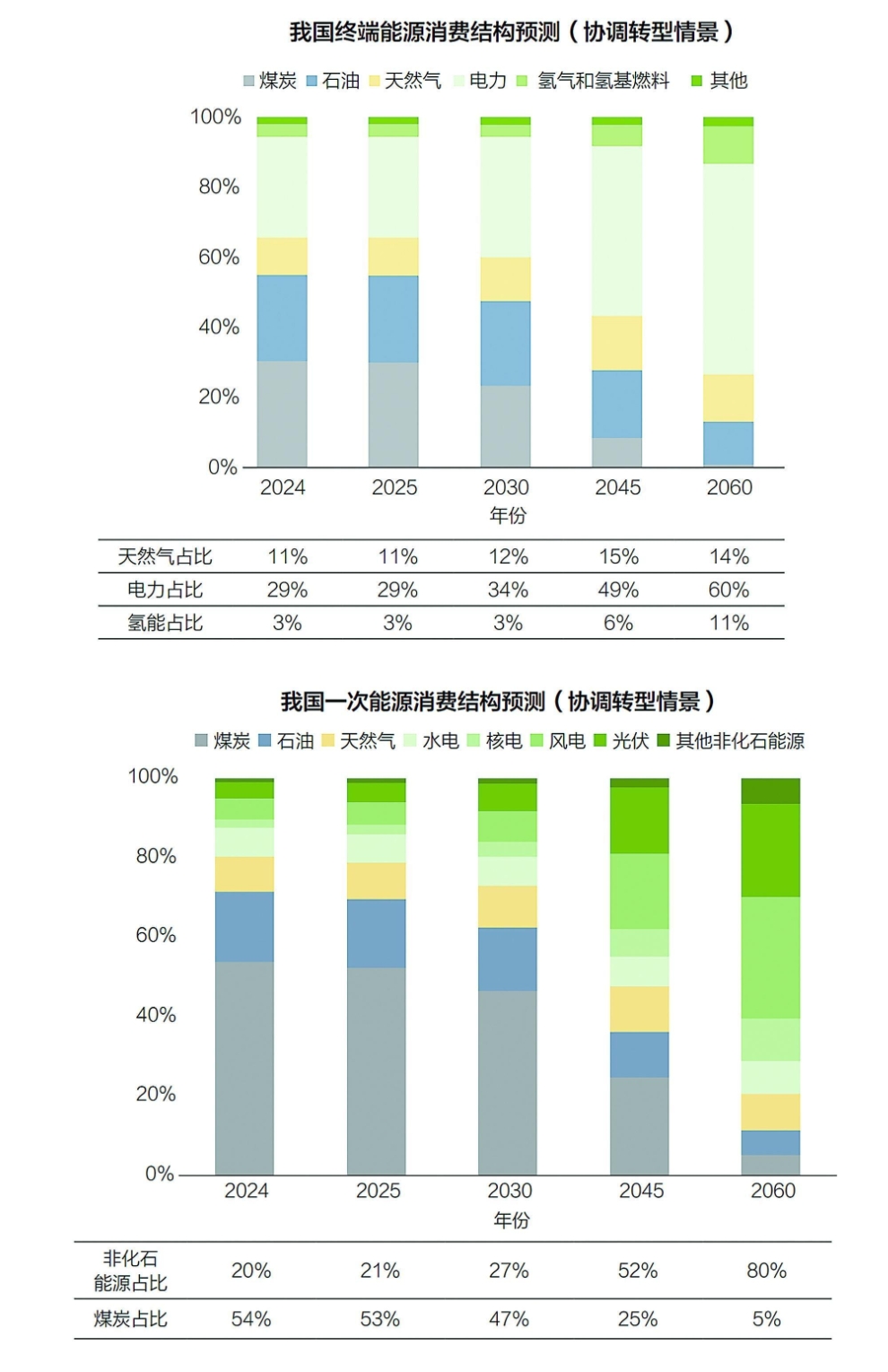 在協(xié)調(diào)轉(zhuǎn)型情景下,2030年前,電力將成為我國終端第一大能源品種,2040年前,可再生能源發(fā)電量占比將突破50%,2045年前,非化石能源消費占比將增至50%。我國一次能源消費總量將自2045年較快下降,到2060年降至59.5億噸標準煤,較峰值水平下降14%。