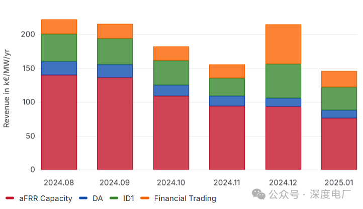 跨市場(chǎng)交易將并行提供雙向aFRR容量的收益與現(xiàn)貨市場(chǎng)的收益相結(jié)合。對(duì)于現(xiàn)貨交易,電池收益指數(shù)假設(shè)首先在日前市場(chǎng)進(jìn)行交易,然后根據(jù)日前拍賣的結(jié)果,在日內(nèi)市場(chǎng)上交易剩余的容量。