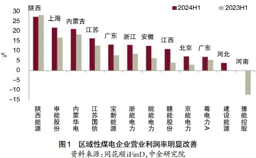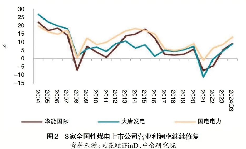 煤電容量電價政策自2024年1月1日起實施,旨在回收部分固定成本、穩(wěn)定煤電行業(yè)預期,保障煤電更好發(fā)揮支撐調(diào)節(jié)價值。在過去幾年部分煤電機組虧損的背景下,容量電價也有望幫助其扭虧為盈,特別是有助于推動煤-電矛盾突出、煤電轉(zhuǎn)型較快地區(qū)、運行時間較短的煤電機組扭虧為盈(見圖1),起到“雪中送炭”的作用。從實際經(jīng)營數(shù)據(jù)看,2024年,煤電企業(yè)的營業(yè)利潤率普遍有所修復,例如華能國際、大唐發(fā)電、國電電力這3家全國性煤電上市公司的營業(yè)利潤率在2024年前三季度在10%左右(見圖2),落入了中金研究院在2024年初發(fā)布的《新型電力系統(tǒng)電價機制:保障煤電發(fā)揮支撐調(diào)節(jié)價值》中提出的合理利潤率區(qū)間。