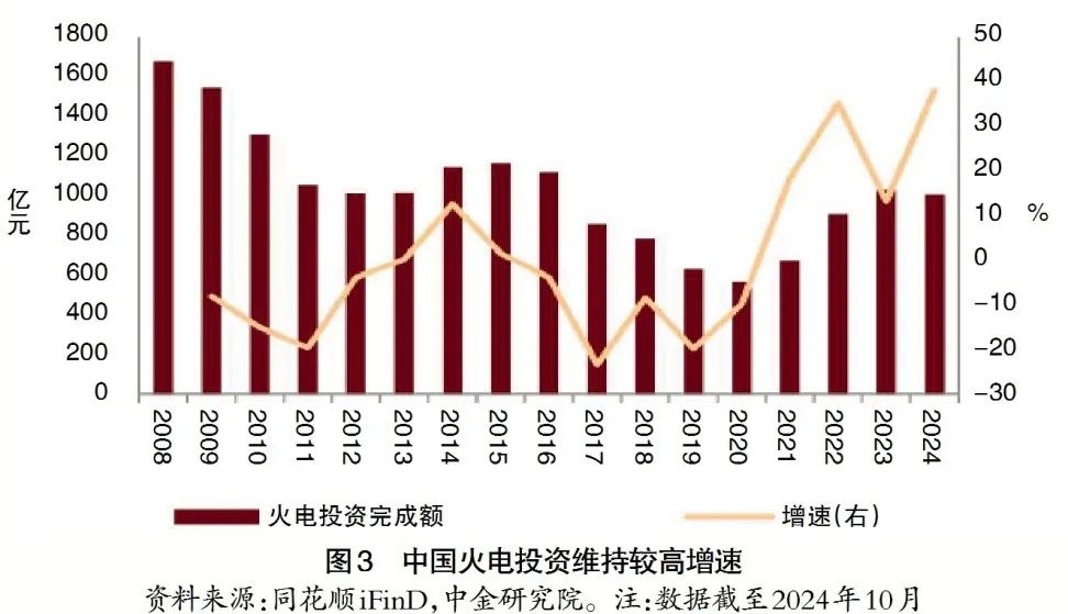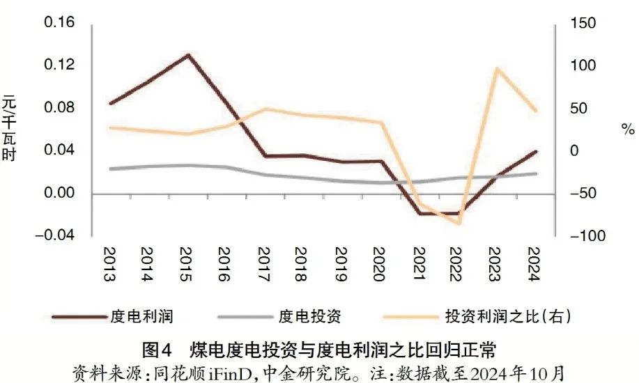 煤電企業(yè)利潤率的修復有利于支撐近年來持續(xù)高位的煤電投資(見圖3)。2021年來,部分地區(qū)出現(xiàn)電力供應緊張甚至限電現(xiàn)象,煤電對于電力保供的價值再次凸顯,隨之而來的是煤電裝機核準量和相關投資快速增長。但2021~2023年煤電企業(yè)在高煤價的壓制下依然存在較大的經(jīng)營壓力,難以支撐快速增長的新增投資,我們可以用度電投資與度電利潤之比衡量企業(yè)利潤中用于投資的比例,這一指標越高說明利潤支撐投資的壓力越大(見圖4)。我們測算發(fā)現(xiàn),近年來度電投資與度電利潤之比大幅偏離過去的平均水平(為40%左右),其中2021和2022年我們估算全國煤電企業(yè)平均度電利潤為負值,2023年度電利潤雖然轉(zhuǎn)正,但度電投資與度電利潤之比接近100%,這意味著企業(yè)當年幾乎沒有剩余利潤用于償還債務、股東分紅,或留存以應對未來不確定性或投資機會。2024年,我們測算煤電企業(yè)的度電投資與度電利潤之比逐步回歸正常,有利于煤電高質(zhì)量健康發(fā)展。